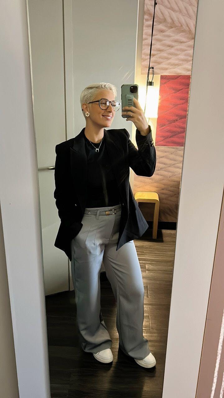 Confeccionada em tecido encorpado de poliéster com leve toque de elastano, a peça mantém a estrutura ideal da alfaiataria, garantindo um ajuste impecável ao corpo.